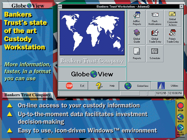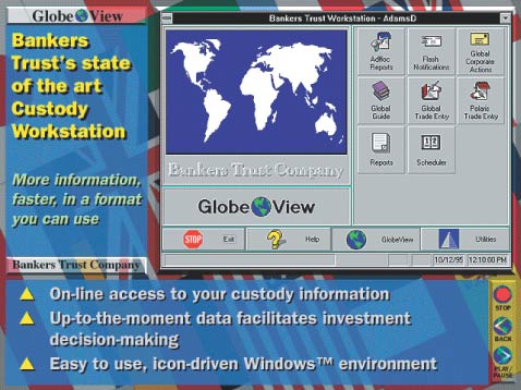 Globe View 2.0 is a service and software program offered by Bankers Trust. BT wanted to promote this service on a single floppy disk which they could feature in kiosks at trade shows and conferences. We produced an interactive introduction to their program and its capabilities, which allowed BT to cost effectively promote its service with a dual-purpose program in the exciting medium of multimedia.