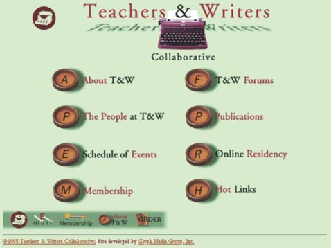 The Teachers & Writers Collaborative, a non-profit organization in New York City, needed to distribute information about its products and services to as large and varied an audience as possible. The World Wide Web allows T&W to present itself to an extremely large audience at their convenience. It gives viewers the ability to join T&W, review the book catalogue, participate in writing activities, find out about T&W’s residency programs, and much more. In all, the project is being developed over two years, in conjunction with the Institute for Learning Technology at Columbia University, and the final Web site will encourage learning and have a live online teaching program through designated schools with high-speed internet connections.