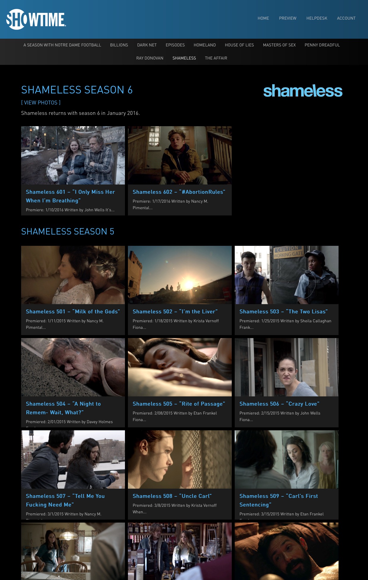 In 2010 Showtime Public Relations needed to preview their recent shows: Homeland and Shameless for business-to-business purposes very quickly. Glyph built them the first, fully functional screener site. It included streaming video, links to the photography collection, user management, and a variety of security functions. The site eventually included their entire offerings of original content for outreach to various media outlets including The New York Times, Hollywood Reporter, Variety, etc.
