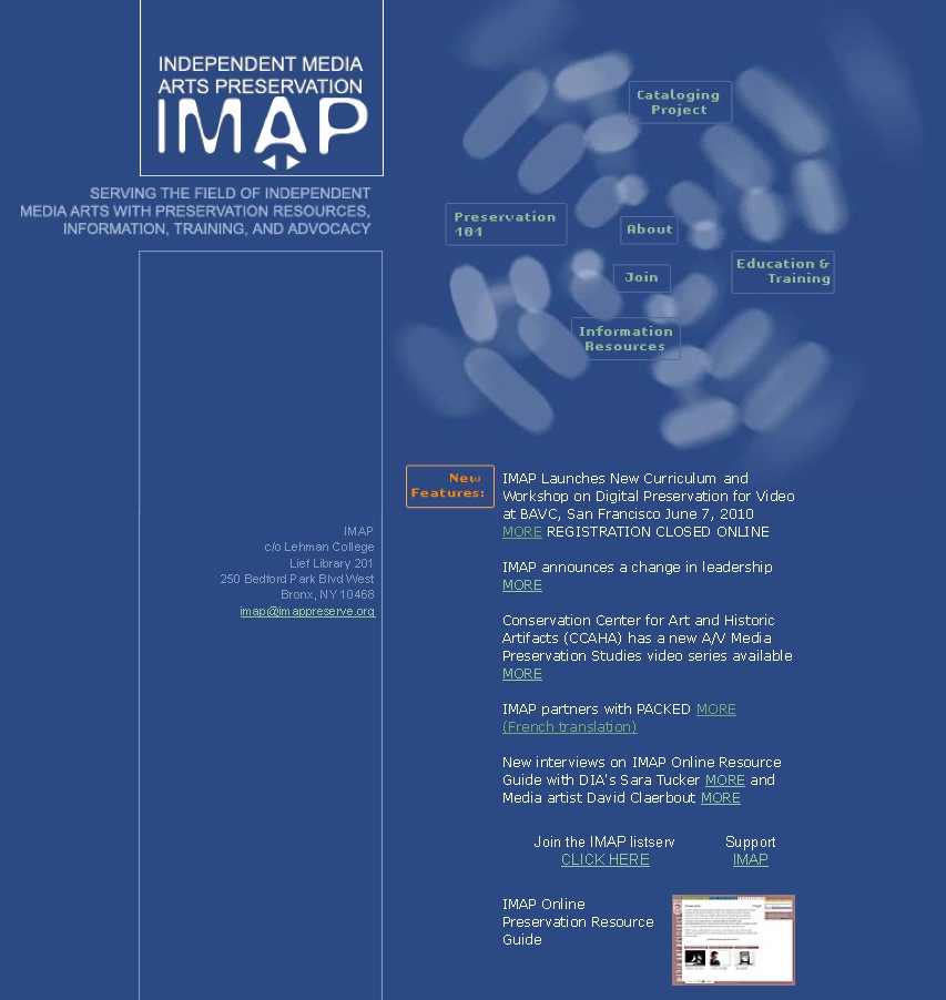 Independent Media Arts Preservation (IMAP), needed a web site to support their cataloguing project and create an awareness for the organization and it’s services. Glyph Media was involved with two phases of the project. First, we consulted with IMAP to produce a three year project development report. This included planning for an IMAP web site, creating a tutorial within that site, and planning/budgeting for the IMAP Cataloging Project Union Catalog (a web-based database). Second, we designed and programmed the first two phases of the web site for IMAP. This site was original built in 1999. Since that time, it has gone through a complete redesign and reprogramming to meet the ever evolving needs of the media preservation community.