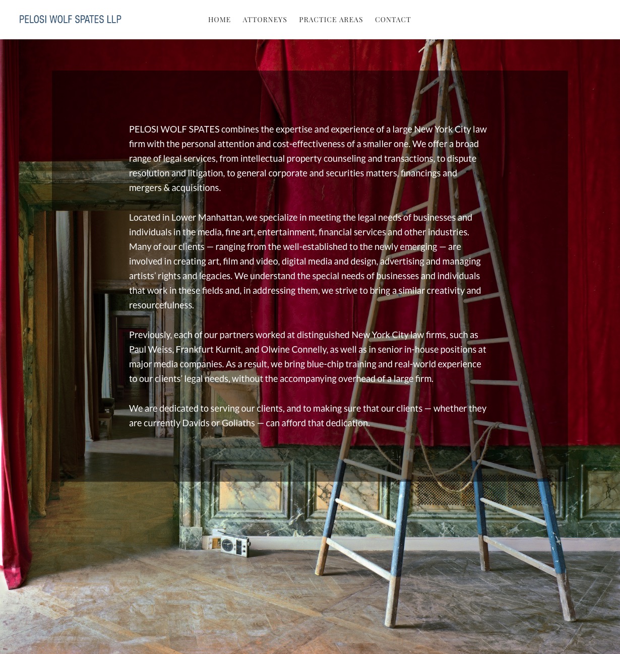 Pelosi Wolf Spates, combines the expertise and experience of a large New York City law firm with the personal attention and cost-effectiveness of a smaller one. They offer a broad range of legal services, from intellectual property counseling and transactions, to dispute resolution and litigation, to general corporate matters, financings and mergers and acquisitions.