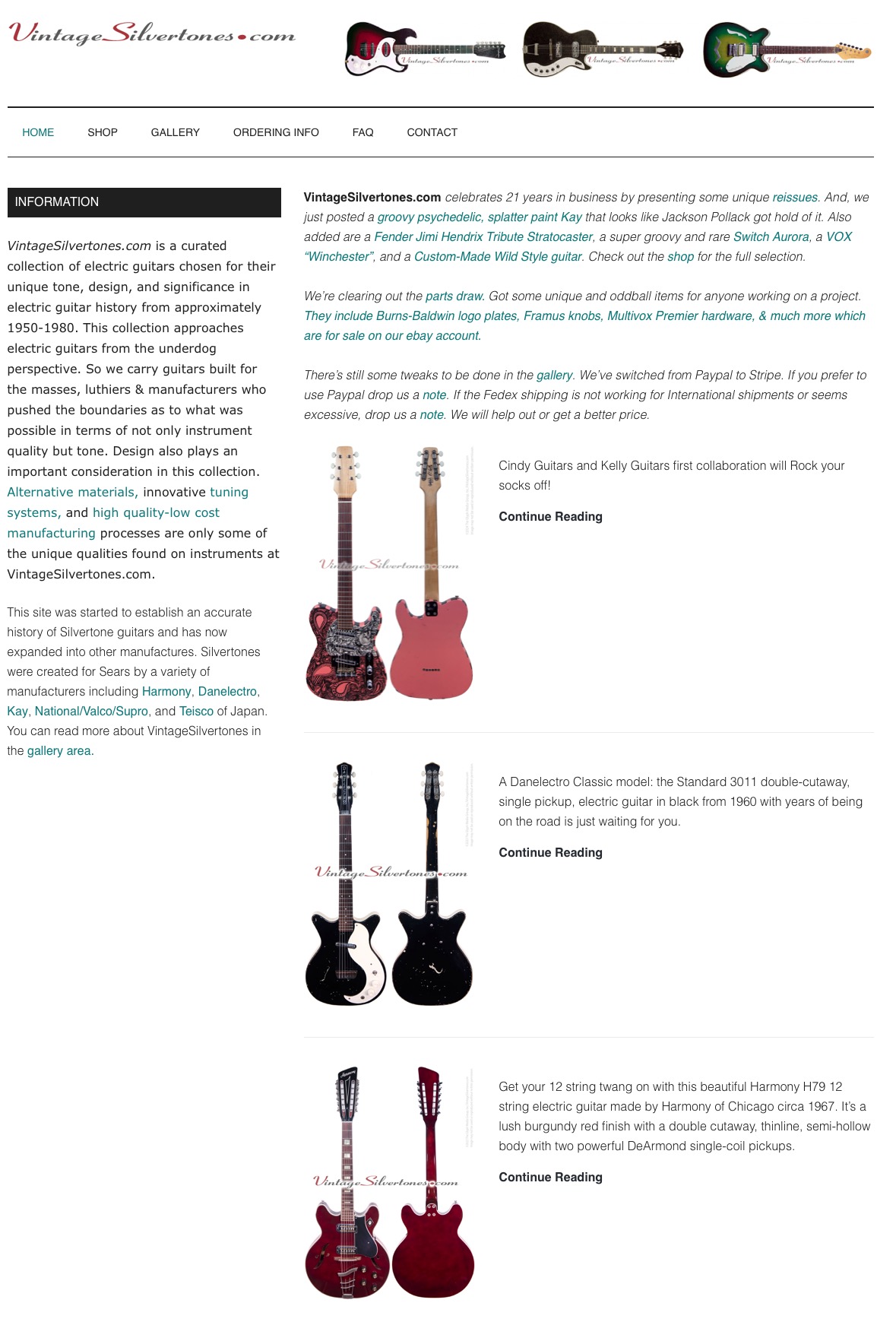 VintageSilvertones.com, is a specialized guitar business that sells unique vintage Silvertone, Danelectro, Kay, Mosrite, Harmony, Supro and many other brands of electric guitars manufactured from the 1950’s through the 1980’s. The guitars are a classic pieces of Americana from a time when even large manufacturing businesses were producing high quality instruments. We recently updated the site to have a full ecommerce system for ordering with Stripe payments and automatic Fedex shipping.