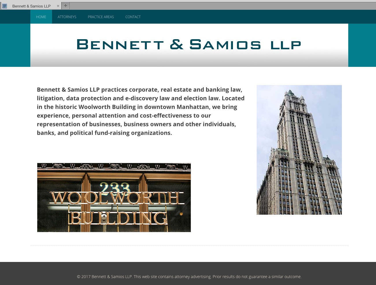 Bennett & Samios LLP practices corporate, real estate and banking law, litigation, data protection and e-discovery law and election law. Glyph Media built and maintains a small business promotional web site for the law firm.