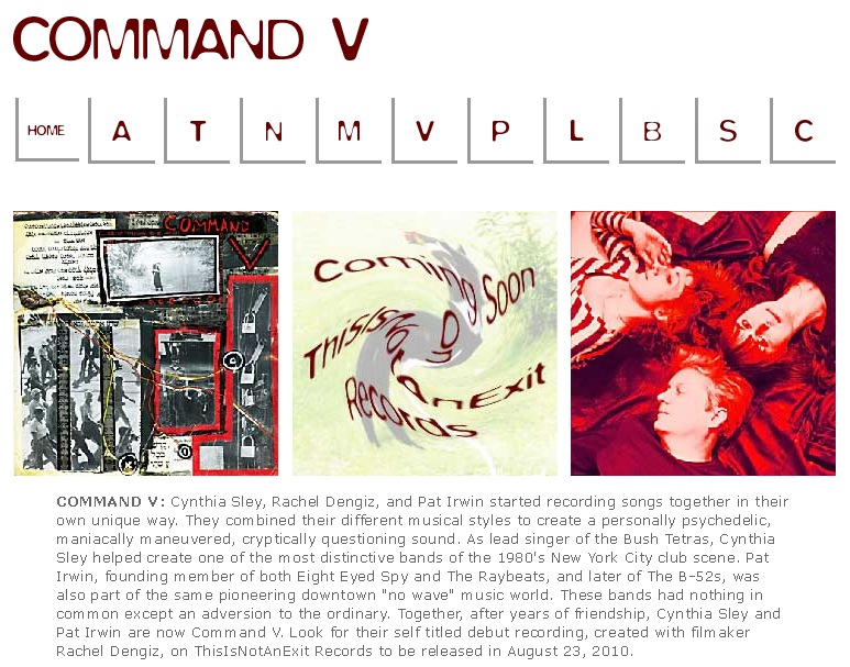 COMMAND V, Cynthia Sley, Rachel Dengiz, and Pat Irwin combine their different musical styles to create a personally psychedelic, maniacally maneuvered, cryptically questioning sound. Key players in the New York No Wave scene from the early 1980’s, Cynthia Sley former lead singer of the Bush Tetras and Pat Irwin, founding member of both Eight Eyed Spy and The Raybeats, and later of The B-52s are bursting onto the scene with a rocking new sound.