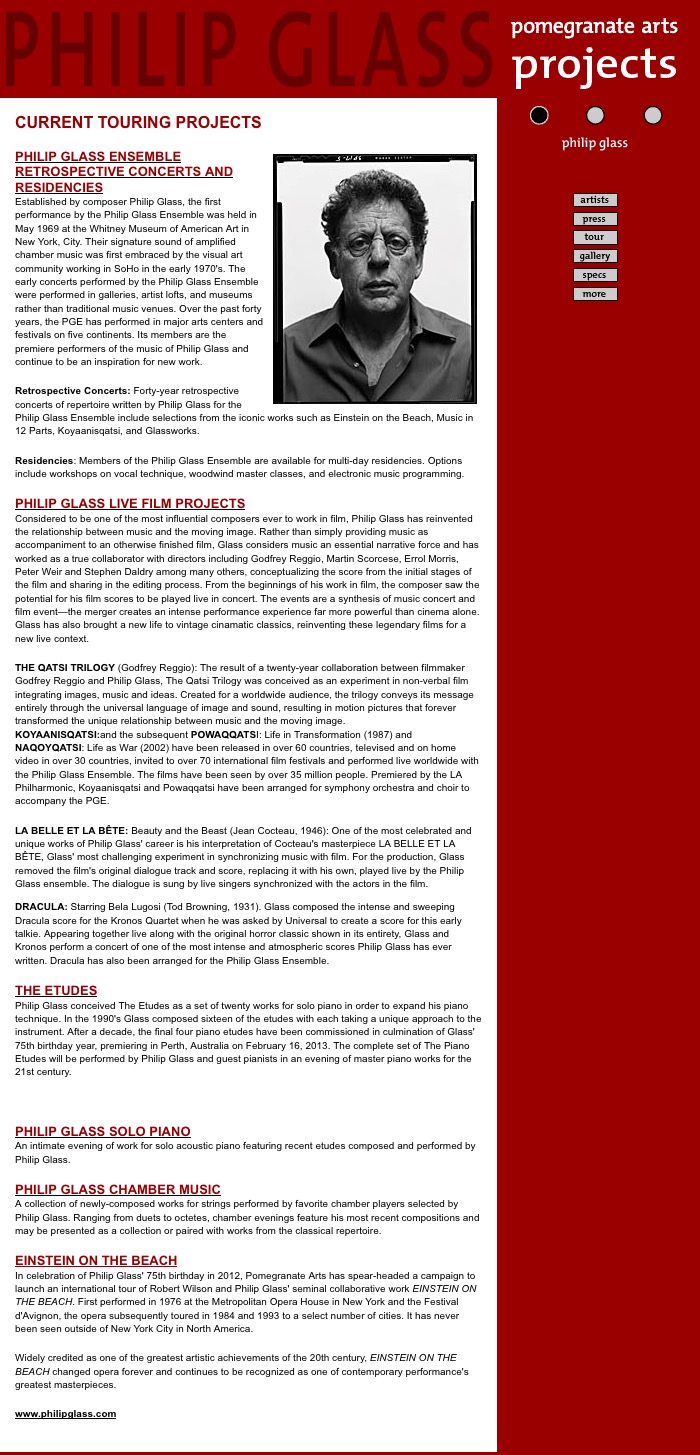 Pomegranate Arts is an independent production company based in New York City dedicated to the development of international performing arts projects that are bold, provocative and emotionally charged. Glyph designed and programmed their web site to help promote their shows, expedite the process of delivering promotional materials to the staging sites, and expand upon the body of information available for each show.