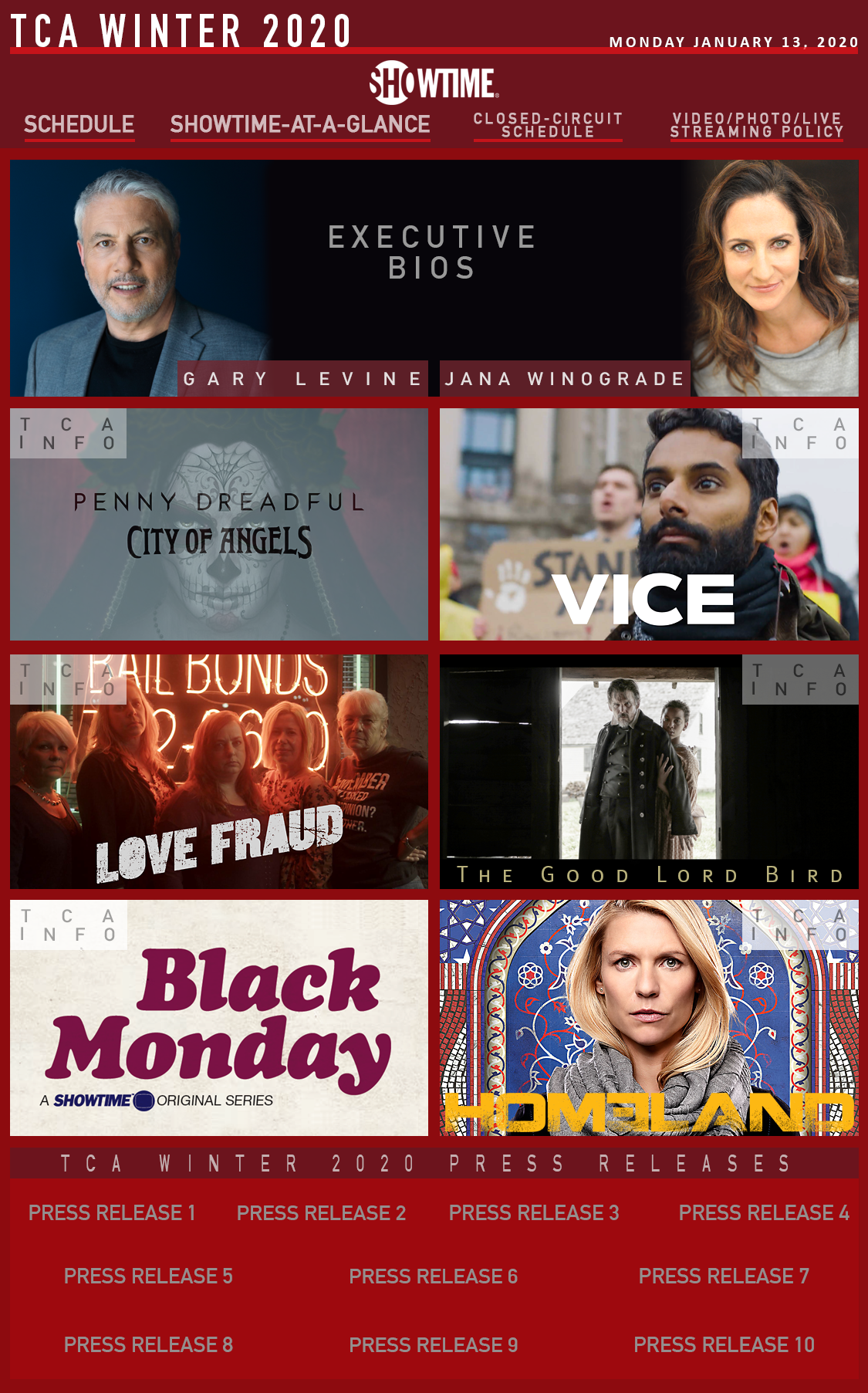 From 2004 to 2020 Showtime, CBS, and The CW hired Glyph to build biannual meeting web sites to promote their offerings at the TCA meetings held in January and August. The worked entailed designing individual pages for each division, along with a show menu, and information page about the meeting. In addition, Glyph built and formatted the documents for each division to use as downloadable press kits. The site also included links to their press sites and video preview sites.