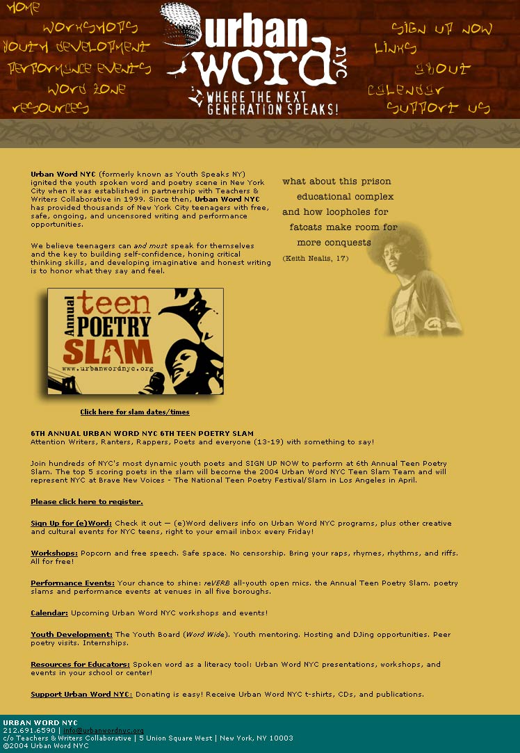 Urban Word NYC, a non-profit organization based in New York City that works with youth and educators to foster creativity through spoken word and poetry classes, slams, and training seminars. They recently commissioned Glyph Media to redesign their web site. The updated entailed a complete redesign based upon their new logo. It also included adding dynamic multimedia content, a sign up form, and extensive information about the organization.
