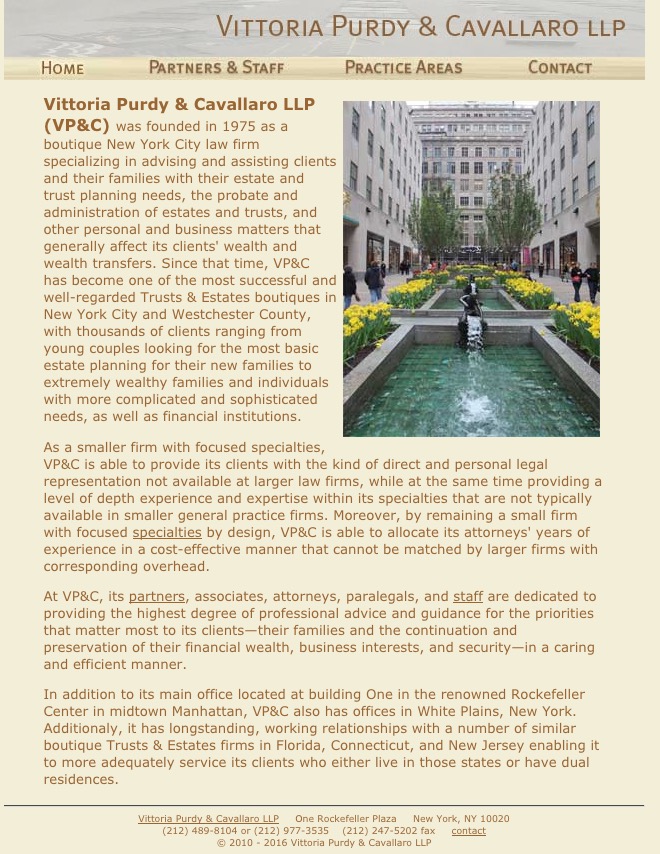 Vittoria & Purdy LLP, a boutique New York City law firm specializing in advising and assisting clients and their families with Estate and Trust planning needs, along with the probate and administration of estates and trusts. Glyph Media created a small informational web site for Vittoria & Purdy LLP that reaches out to current and potential clients. The site was designed to be optimized for viewing on both computers and smart-phones.